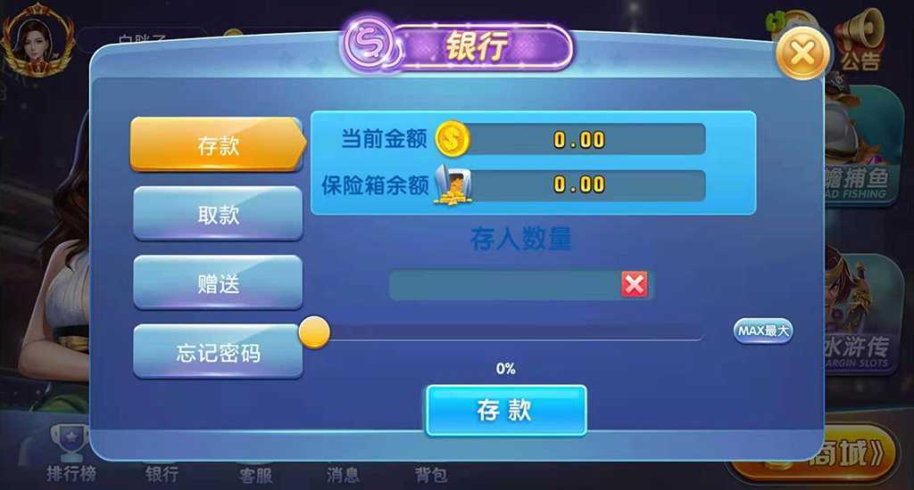 A8电玩属于网狐荣耀内核开发,游戏大厅使用全动态效果设计,让玩家体验不一样的游戏感觉,界面设计炫美,吸引性比较好,平台含背包功能,并以金蛋形式使用游戏道具。大厅含有多款主流电玩游戏,其中分别有寻龙夺宝、龙虎斗、红黑大战、奔驰宝马、飞禽走兽、铃铛游戏、摇一摇、李逵劈鱼、金蟾捕鱼、百人牛牛、百家乐、水浒传等游戏。电玩大厅功能介绍:支持用户使用兑换码换取余额、排行榜查询、保险柜余额管理、在线联系客服人员、站内信息接收、以及背包等功能。A8电玩支持商城系统,用户可以到商城在线充值、以及兑换游戏道具等操作。网站程序已集成充值接口,目前对接了第三方支付平台,只需简单申请商户密钥,填写后即可完成用户充值功能。程序组件说明:前台游戏网站,后台管理网站,APP安卓客户端,luac文件,脚本代码,数据库。游戏演示截图: